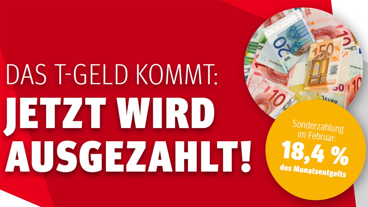 Ein Erfolg aus der letzten Tarifrunde der Metall- und Elektroindustrie macht sich jetzt im Februar bemerkbar. Das T-Geld - und für Baden-Württemberg der Trafo-Baustein - werden ausgezahlt. Dazu haben wir einen Anspracheflyer und Share-Pics für Euch.