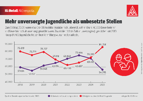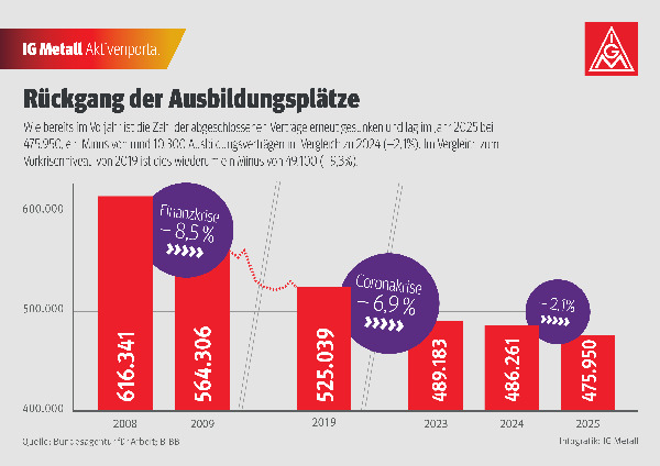 Einmal im Jahr veröffentlicht die IG Metall ihre Bilanz zur Situation auf dem Ausbildungsmarkt mit besonderem Fokus auf ihre Organisationsbereiche. Die Bilanz für 2024 zeigt: Es besteht Grund zur Sorge, denn die Zahlen fallen erneut. Wir haben Material und zeigen Euch, was der Betriebsrat tun kann.
