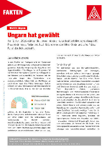 Das Faktenblatt gibt einen Überblick über das vorläufige Ergebnis, den voran gegangenen Wahlkampf und mögliche Auswirkungen der neuen Regierung auf die EU und die Gewerkschaftslandschaft in Ungarn.
