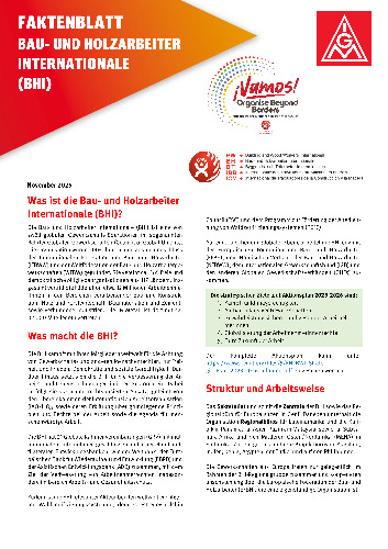 Die globale Gewerkschaftsföderation Bau- und Holzarbeiter Internationale (BHI) vertritt etwa 12 Millionen ArbeitnehmerInnen in den Bereichen verarbeitender Bau und Konstruktion, Holz und Forstwirtschaft, Baumaterialien und Zement, sowie verbundene Industrien. Gemeinsam mit ihren Mitgliedern kämpft die BHI für die Achtung von Gewerkschafts- und anderen Menschenrechten, für Freiheit und Frieden sowie für Demokratie und soziale Gerechtigkeit weltweit.