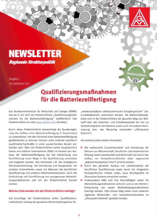 Qualifizierungsmaßnahmen für die Batteriezellfertigung, Newsletter Regionale Strukturpolitik Nr. 4, 06.09.2021