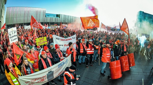 Mehr als 2500 Beschäftigte von Thyssenkrupp Elevator haben in Essen vor der Konzernzentrale für eine Beschäftigungs- und Standortsicherung Druck gemacht, darunter mehr als 350 Kolleginnen und Kollegen vom Hamburger Fahrtreppenwerk, den Aufzugsniederlassungen und von Tepper.