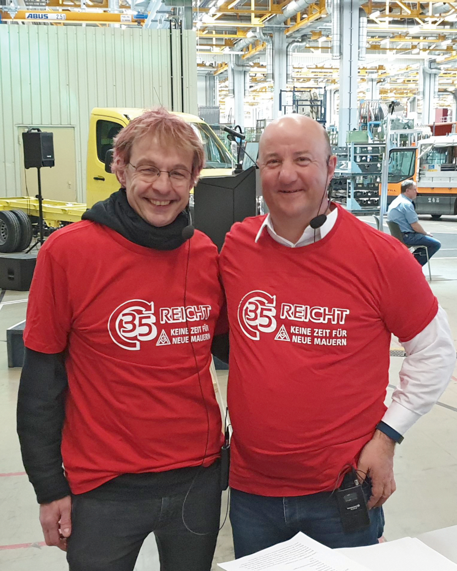 Unterstützung erfuhr die Belegschaft von Michael Brecht, Konzern- und Gesamtbetriebsratsvorsitzender der Daimler AG: „Als ich 1984 meine Ausbildung beendete, habe ich für die 35-Stunden-Woche gestreikt. Sie ist nach wie vor ein gutes Modell für mehr Flexibilität in den Unternehmen, um das man uns in der Welt beneidet“, sagte Michael Brecht. „Wir brauchen keine Drohgebärden der Unternehmen. 30 Jahre nach dem Mauerfall ist es höchste Zeit, dass die 35-Stunden-Woche auch in den Betrieben im Osten zum Regelfall wird.“