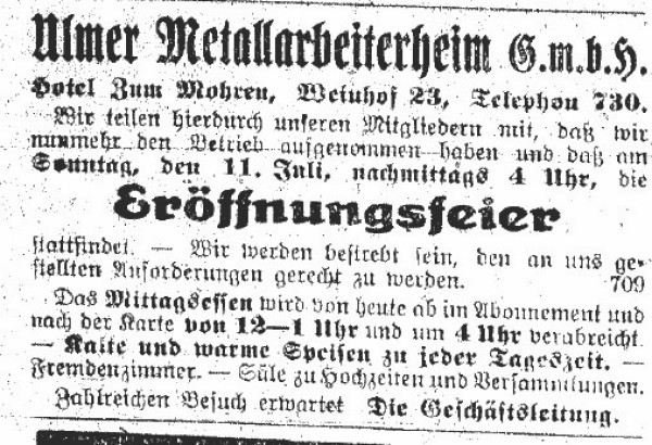 Am 10. Mai 1920 trafen sich beim Notar des Ulmer Grundbuchamts die beiden Bevollmächtigten des Deutschen Metallarbeiter-Verbands, Max Denker und Ernst Eisele, mit der Gastwirtswitwe Sofia Rieser, um einen Kaufvertrag über 290 000 Reichsmark über das „Gasthaus zum Mohren“ abzuschließen. Nach einer kurzen Umbauphase öffnete das „Ulmer Metallarbeiterheim“, wie es damals hieß, am 11. Juli 1920 als Anlaufstelle der Arbeiterschaft seine Türen.